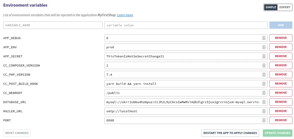 APP_DEBUG = 0 (ou 1 si vous voulez activer le mode debug) APP_ENV = prod (ou dev) APP_SECRET = ThisTokenIsNotSoSecretChangeIt CC_WEBROOT = /public MAILER_URL = smtp://localhost DATABASE_URL = contenu de MYSQL_ADDON_URI